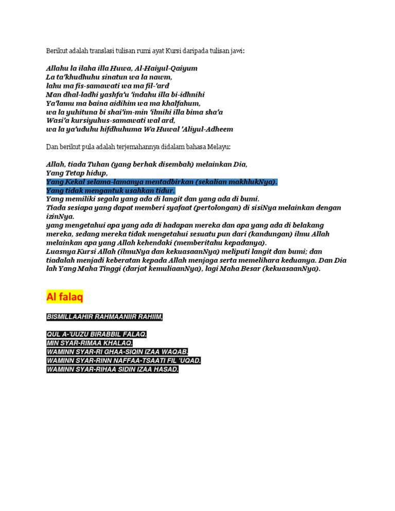 Dan tiadalah menjadi keberatan kepada allah menjaga serta memelihara keduanya. Ayat kursi (jawi & rumi). Ayat kursi semua umat muslim pasti sudah tahu. Bacaan ayat kursi rumi jawi dan terjemahan elite blog 328 pm ayat al quran ayat kursi rumi jawi dan terjemahan alhamdulillah kami panjatkan kehadirat alloh swt yang memberi nikmah hingga kita dapat bersua di blog wirid dan doa nih. Pada masa ni masih seputar surah dalam al quran.