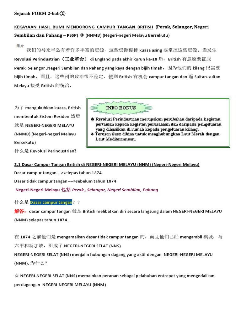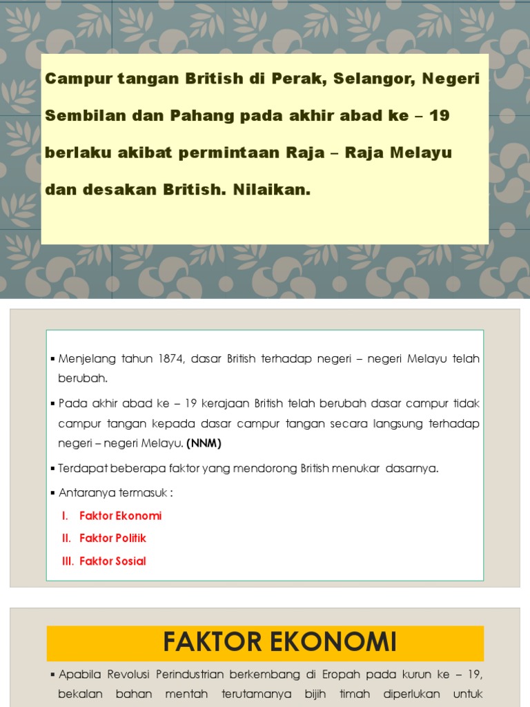 Terdapat pelbagai faktor yang menyebabkan british campur tangan dalam sistem pentadbiran kesultanan di tanah melayu. Sistem pendidikan selepas zaman british. Sejarah stpm kertas 2 sejauhmanakah faktor ekonomi menyebabkan perubahan dasar tidak campur tangan kepada dasar campurtangan british di tanah melayu pada tahun 1874. Pertukaran dasar 1873, kemenangan parti konservatif telah menukar dasar tidak campur tangan kepada dasar campur tangan. Antara 1867 hingga 1873 berlaku perang kelang rebutan takhta yang berlaku, anak saudara dan menantunya. Kegagalan british campur tangan di johor sehingga tahun 1914. Antaranya ialah ingin mendapatkan bahan mentah akibat daripada permintan yang meningkat di eropah. · dato' maharalela membina kubu di pasir · dasar penaklukan british. British memaksa masyarakat tempatan menerima. Sistem pelbagai ini menjejaskan perpaduan kaum. Campur tangan british secara langsung di tanah melayu didorong oleh perubahan terhadap politik antarabangsa, iaitu persaingan antara negara barat untuk meluaskan wilayah. Penglibatan british di johor bermula sejak kedatangan raffles dan pembukaan singapura pada tahun 1819. Johor merupakan negeri melayu terakhir yang menerima penasihat british.