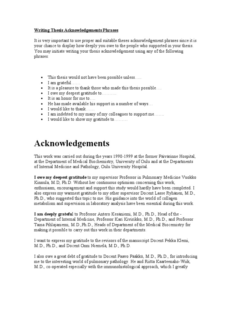 What it is and what it contains. Members of academia and other professionals. How to write acknowledgements for report or thesis. Table of contents 3 acknowledgement examples 5 acknowledgements for project Importance of a thesis acknowledgement. The main purpose of having an acknowledgement page is offering a thankful note to those who before setting out to craft a thesis acknowledgment, it is important to start by making a list of the people who helped you or are linked to the study in any way. Use these 20+ sample of acknowledgement letter & acknowledgement format example ready to download in word or pdf format. This work would not have been possible without the financial support of the vanderbilt physician scientist development award, the american roentgen ray society scholarship or the vanderbilt university medical center department. Browse our 14 uk dissertation acknowledgements examples now. Some universities only allow students to acknowledge those who have directly contributed to the content, i.e. As far as the length is concerned, there is no restriction. I would like to thank my mother for providing me with delicious dinners when i came. D, acknowledgement thesis example supervisor ielts practice materials made available to duchamp.