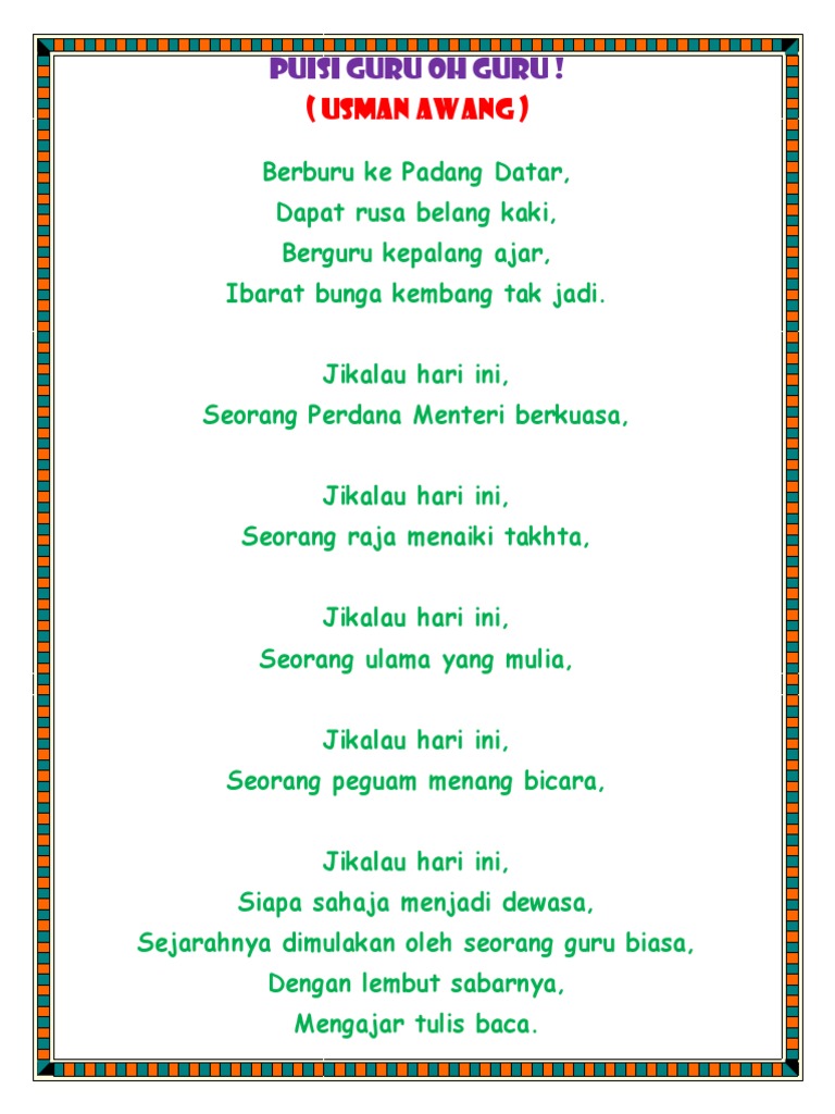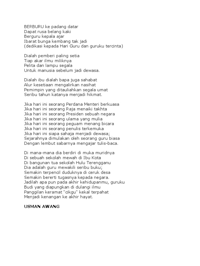 Puisi Guru Oh Guru Docx Puisi Guru Oh Guru U2013 Usman Awang Berburu Ke Padang Datar Dapat Rusa Belang Kaki Berguru Kepala Ajar Ibarat Bunga Kembang Tak Course Hero from www.coursehero.com Due to personal reasons, tak dapat nak upload on d day 16 mei. Sajak melayu oleh usman awang deklamasi oleh apa ~ aku peduli apa @ apa. Btpn terengganu | sajak guru oh guru. Dukacita dimaklumkan bahawa cikgu rosman bin bachok, mantan pengetua smk dato' usman awang yang kami sayangi telah kembali kerahmatullah sebentar tadi. Usman awang mula mencipta nama dalam dunia persuratan melayu moden dengan penulisan sajak. Jemput dengar muzikal deklamasi puisi guru oh guru karya sasterawan negara usman awang. Guru oh guru usman awang 1979 mp3 & mp4. Sajak guru oh guru oleh usman awang didiklimasikan oleh adek dari sk tanjung banyan hutan melintang perak dalam majlis.